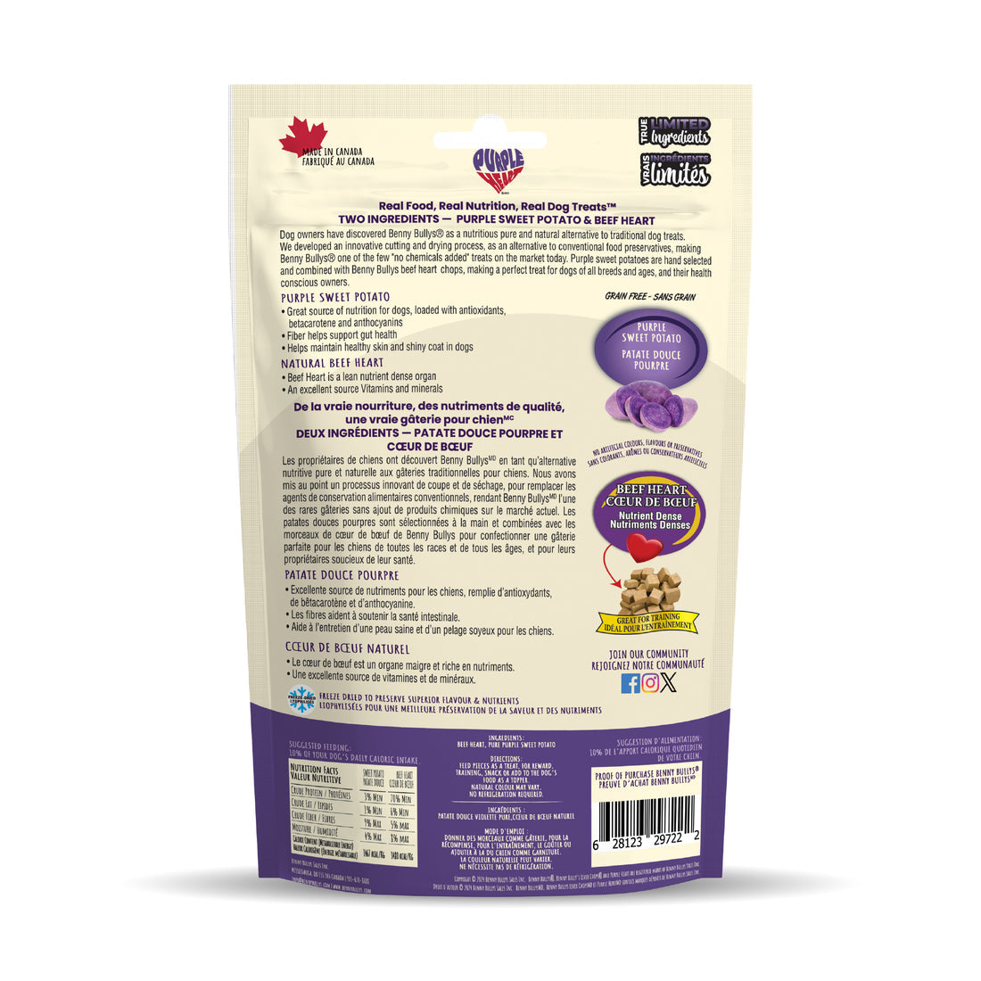 We developed an innovative cutting and drying process, as an alternative to conventional food preservatives, making Benny Bullys® one of the few "no chemicals added" treats on the market today. Purple sweet potatoes are hand selected and combined with Benny Bullys beef heart chops, making a perfect treat for dogs of all breeds and ages, and their health conscious owners.
