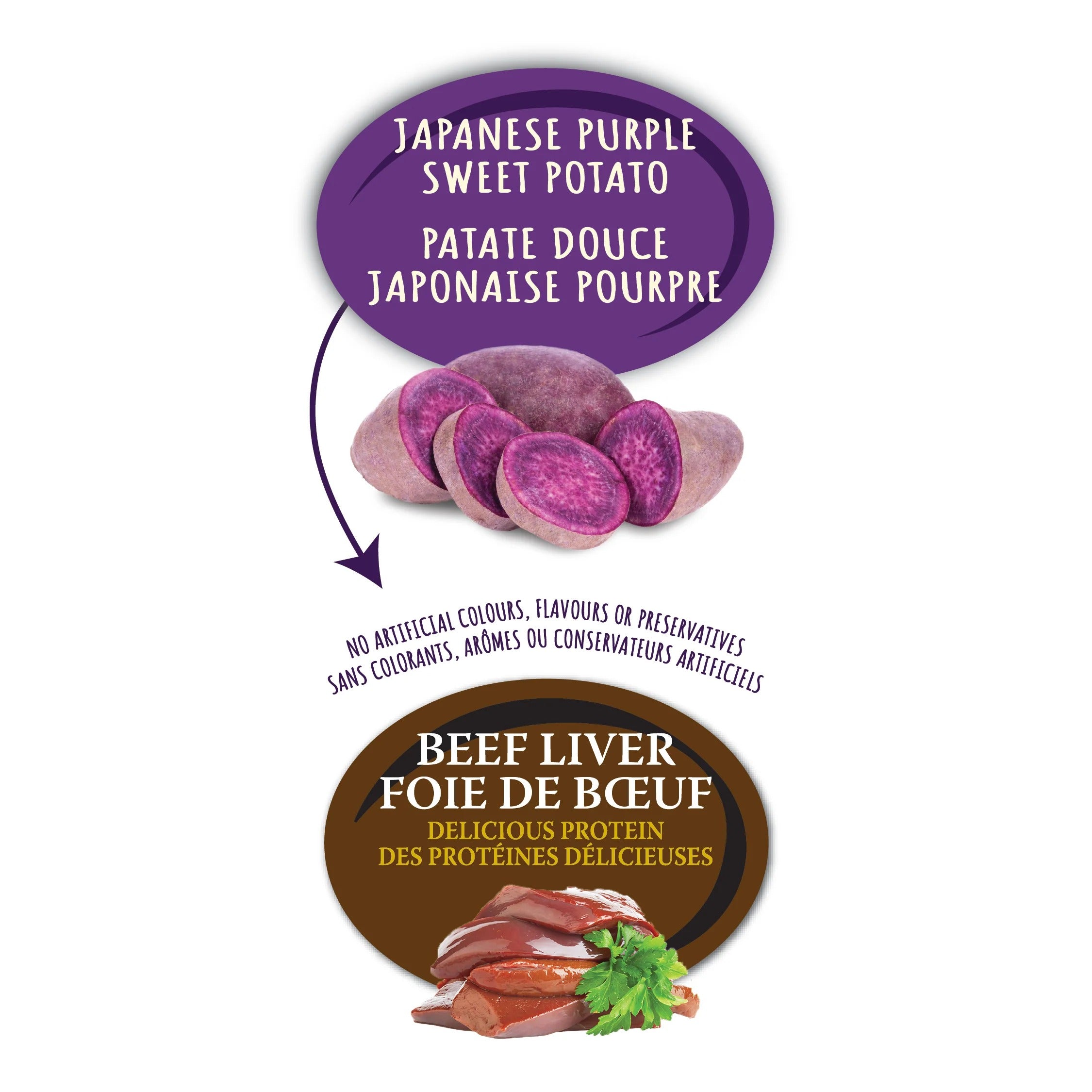 Dog owners have discovered Benny Bullys® as a nutritious pure and natural alternative to traditional dog treats. We developed an innovative cutting and drying process, as an alternative to conventional food preservatives, making Benny Bullys® one of the few "no chemicals added" treats on the market today. Japanese purple sweet potatoes are hand selected and combined with Benny Bullys beef liver, making a perfect treat for dogs of all breeds and ages, and their health conscious owners.