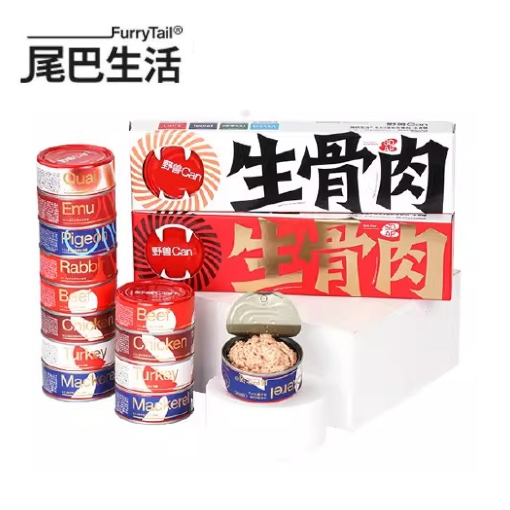 Rabbit:Frozen rabbit (30.0%), water, frozen chicken thighs (with bone) (13.5%), frozen chicken (7.6%), frozen rabbit heart (7.0%), frozen rabbit liver (5.0%), frozen rabbit lung (3.5%), frozen chicken cartilage (3.0%), frozen rabbit kidney (2.0%), fish oil (from salmon), egg yolk powder (1.0%), spray-dried chicken plasma protein powder (0.5%), brewer's yeast extract (FTP-21 patented product) (0.1%).