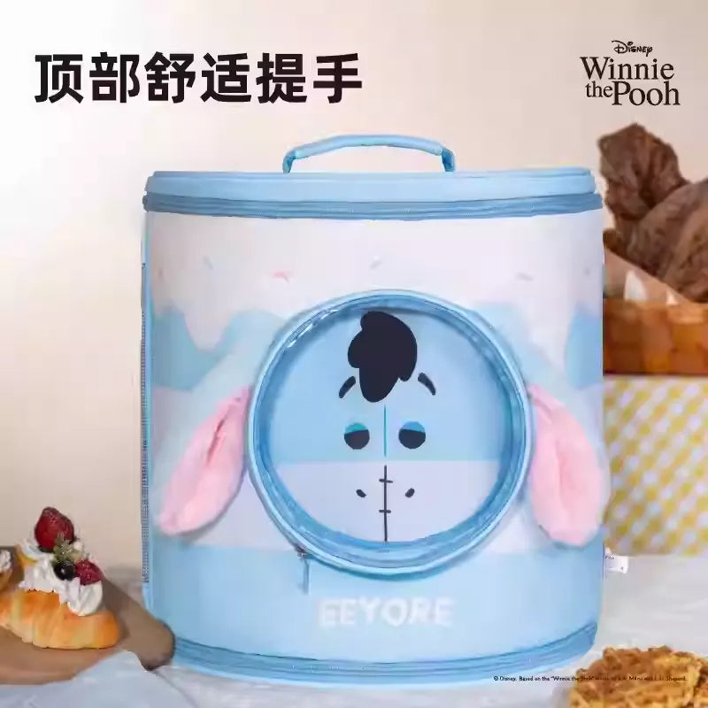 Two adorable styles available — Pooh Honey Jar Backpack and Eeyore Cheese Jar Backpack. Designed with a transparent front window and a built-in roll-up curtain for privacy. Features dual carrying options with both backpack and handheld modes, plus a soft top handle for comfort.
