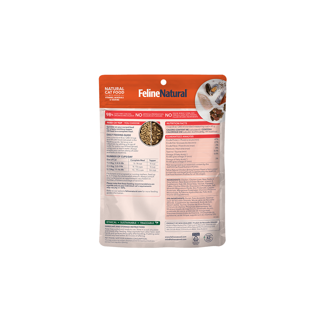我们这款营养全面均衡的冻干新西兰鸡肉和帝王鲑鱼盛宴,含有 98% 的散养鸡肉和内脏,以及可持续养殖的帝王鲑鱼,并添加了新西兰绿贻贝、维生素、矿物质和牛磺酸,有助于维持猫咪的全身健康。