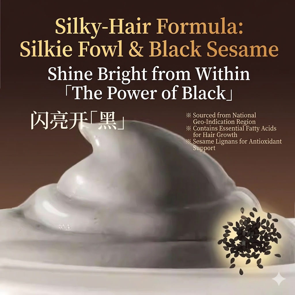 亮泽毛发和皮肤:本产品采用黑芝麻和必需脂肪酸配制而成,从内而外改善毛发健康,打造“亮黑色”毛发。