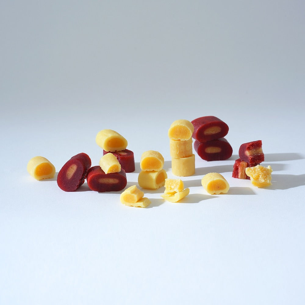 这款芝士蛋卷狗零食口感丰富,味道鲜美,由蛋黄和优质意大利马斯卡彭奶酪制成。它味道顺滑,香气浓郁,适口性极佳,是喜爱芝士零食的狗狗的完美选择。