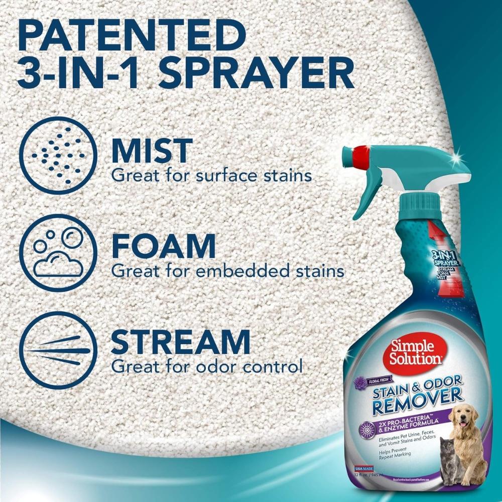 去除宠物污渍-Simple Solution Floral Fresh宠物污渍和异味去除剂可消除和中和顽固的宠物污渍和异味,如尿液、粪便或呕吐物,留下令人愉悦的花香。